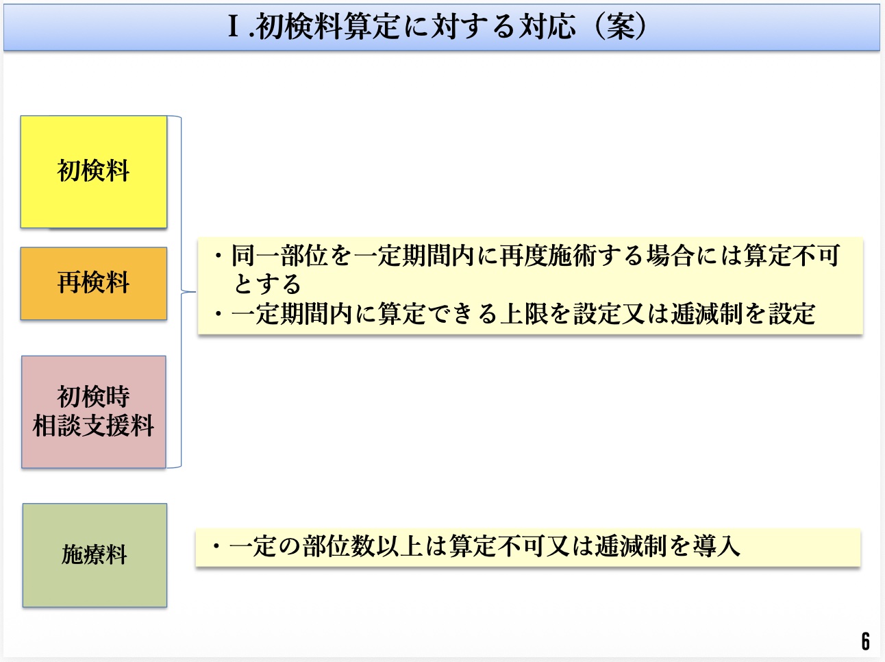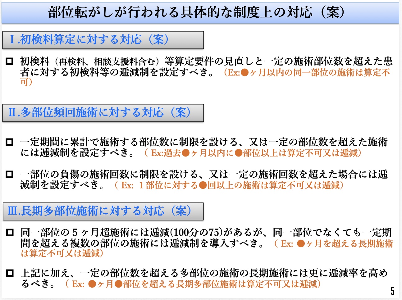 令和8年療養費改定に向けた具体案の中で、「部位転がし」対策としての算定上限や逓減案(単価削減)が議論されています。